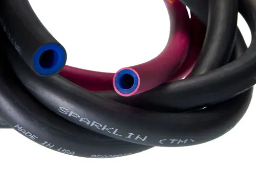 Weld Spatter Resistant Tubing is made by taking blue Polyurethane 95A tubing and jacketing it with a specially formulated weld spatter resistant cover. The result is a jacked tube that resists incidental weld spatter contact. The outer cover base resin meets UL94V0 requirements and offers strong insulating properties. It also resists oils, greases, acids, bases, aqueous solutions, ozone, heat-aging and ultraviolet light. The cover is approximately .030” thick and does not adhere to the inner tube, allowing the jacket to be easily skived back for fitting connection with conventional compression or push-in fitting.